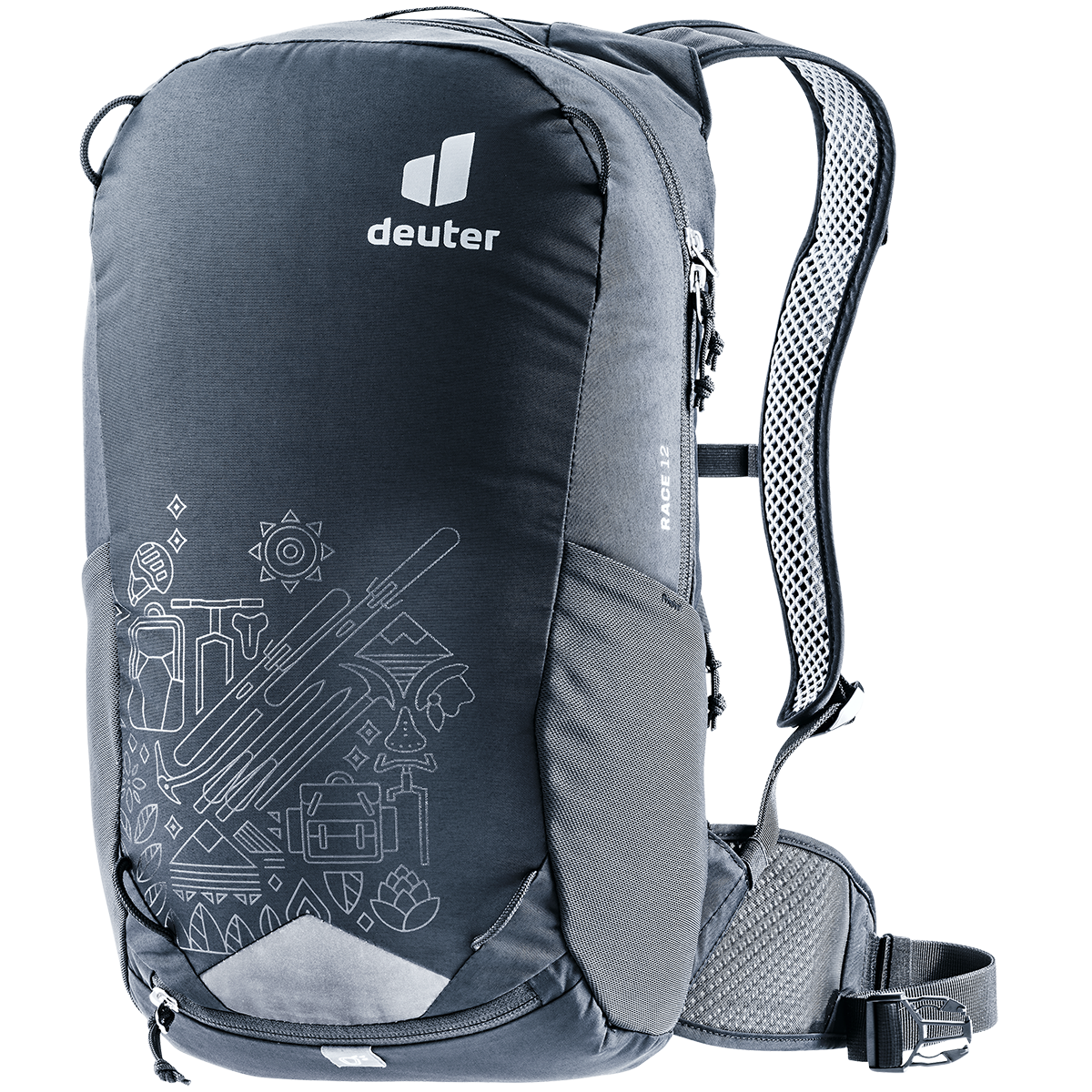 The ergonomically-shaped hip fins and shoulder straps fit snugly and ensure a wobble-free fit on demanding trails. The light, airy mesh fabric of the straps and the tried-and-tested deuter AIRSTRIPES SYSTEM ensure ideal ventilation on sporty trails. The 12-litre version is the medium size in the RACE series and is ideal for day trips.