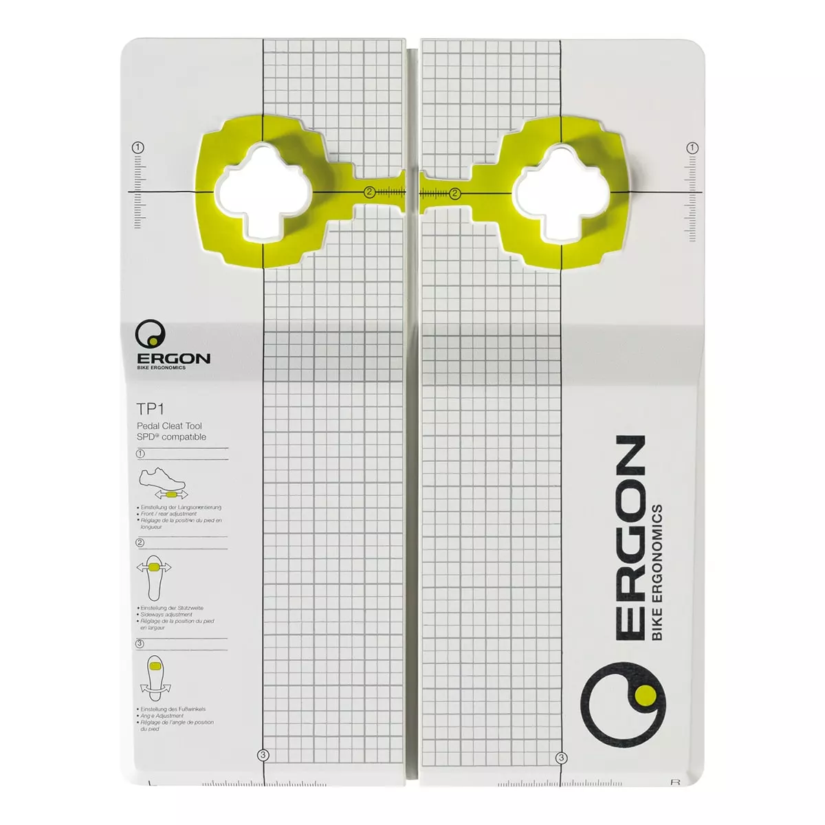 The Ergon TP1 Pedal Cleat Tool allows for a precise and easy adjustment of your SPD cleats and makes for an ergonomically correct position of your feet on the pedals. Apart from a precise adjustment of the cleats to your cycling shoes, the TP1 tool allows you to adjust the position of your feet with grid patterns on top. The tool is made from polypropylene for high resistance against scratches. The included manual gives helpful tips as well as some basic information on ergonomics and on the tool’s handling.