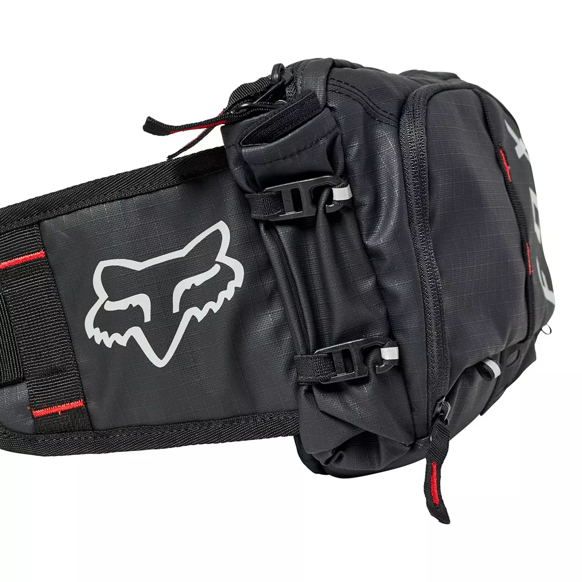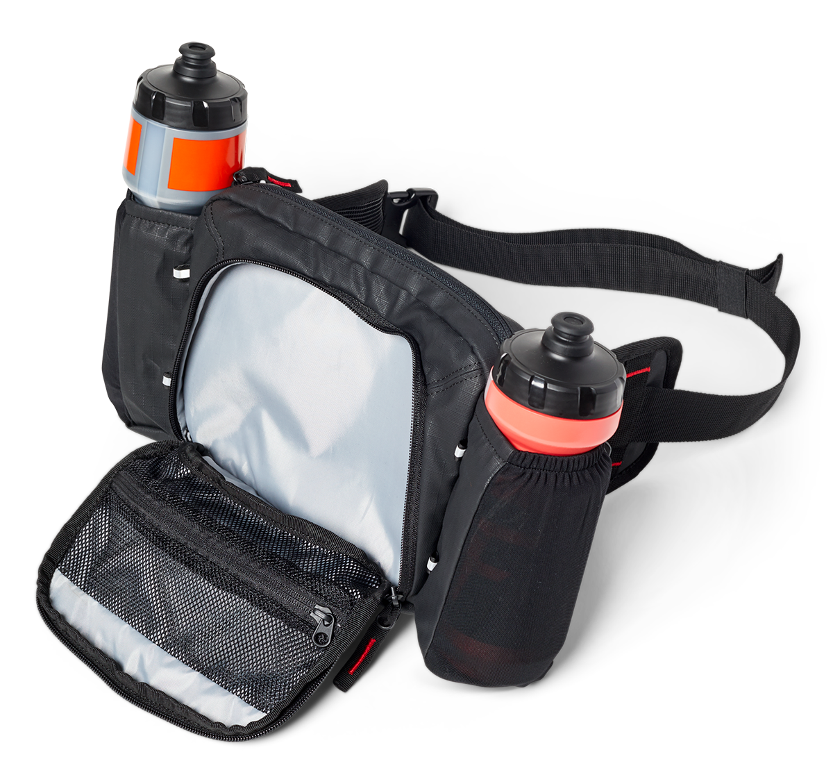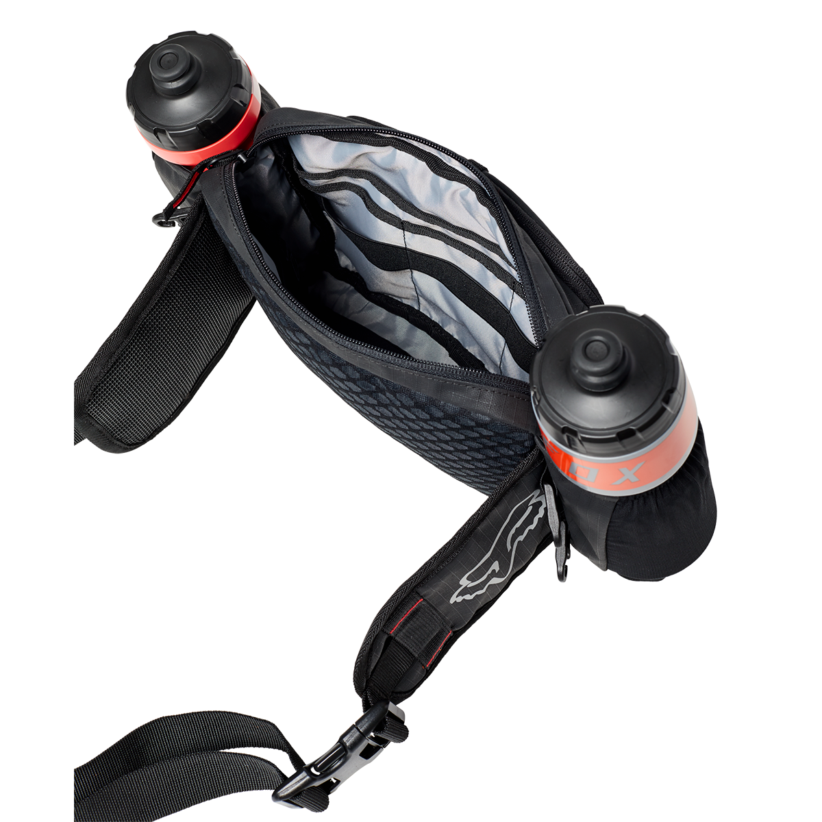 The HIP PACK by FOX is a minimalist hip bag that offers you enough storage space for your essentials with its 2 litres of volume. Your back remains free, the load is better distributed and you have absolute freedom of movement. Particularly practical are the two foldable bottle holders, which offer space for one drinking bottle each. When not in use, you can simply roll up the two compartments and secure them with hooks to save space.
