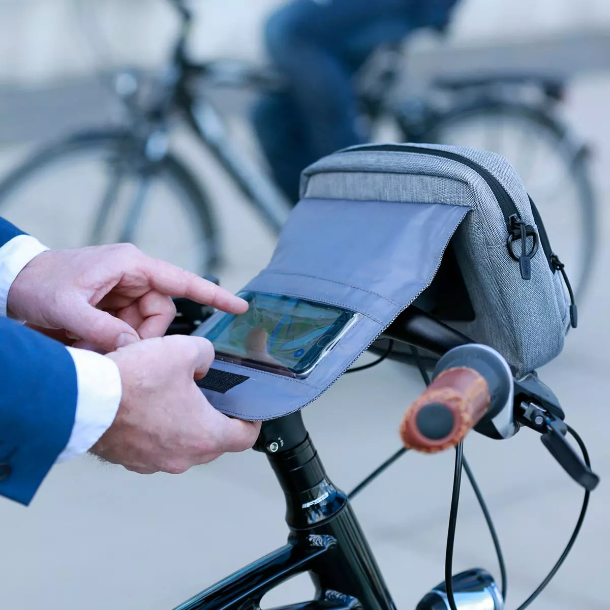 The KLICKfix SMARTBAG TOUCH handlebar bag is a modern shoulder bag with an integrated smartphone compartment The open bag can be secured to the stem with Velcro, so you can always keep an eye on your smartphone while biking.