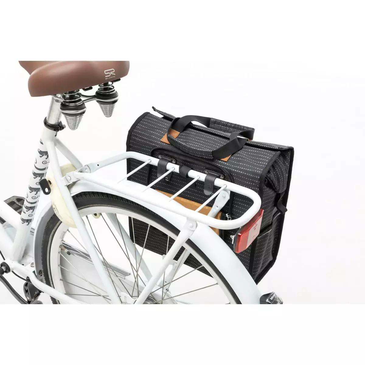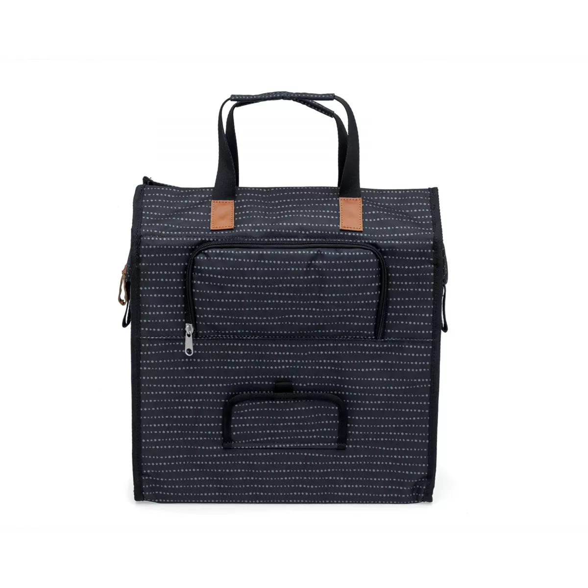 The LILLY NOMI is a handy shopper by New Looxs made from water-repellent polyester. The pannier has a spacious main compartment and three smaller front pockets to stow groceries or other items.