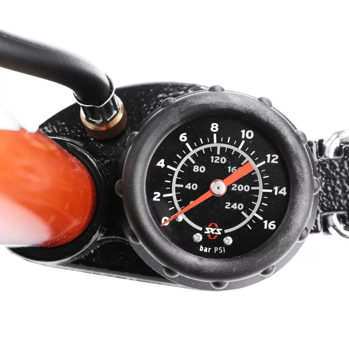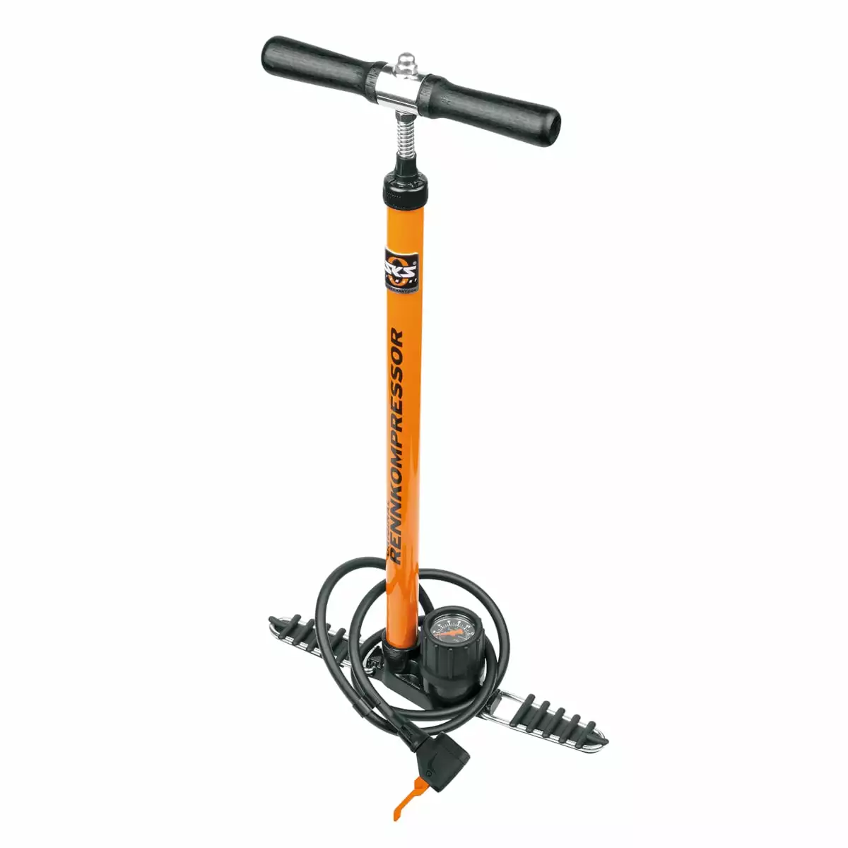 Rock solid and above all reliable – the Rennkompressor pump by SKS Germany has already been popular among international cyclists for more than 40 years now. The pump with a MultiValve head is suitable for Schrader, Presta and Dunlop valves and features and extra-long hose with a length of 120 cm. The barrel of the floor pump is designed to withstand pressures of up to 16 bars. The pump comes with fold-out steel feet, a wooden handle and is secured against slipping at the valve.