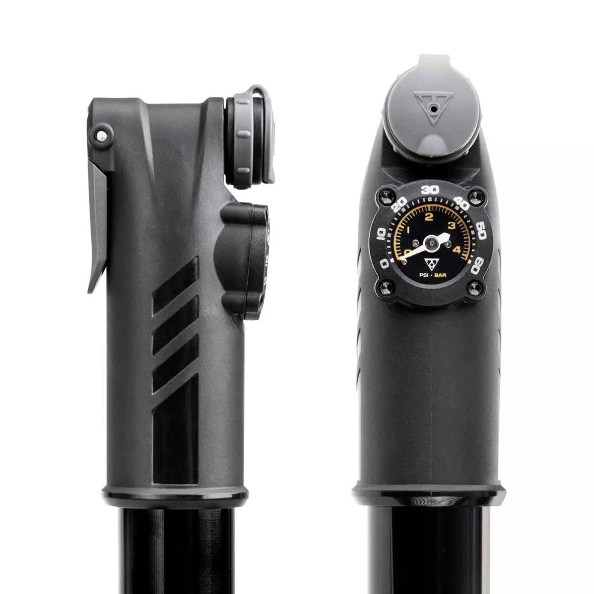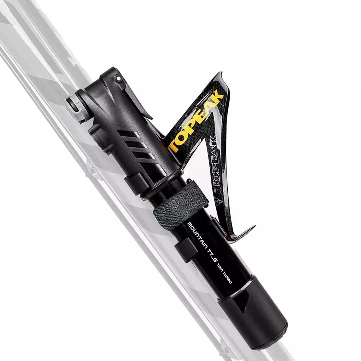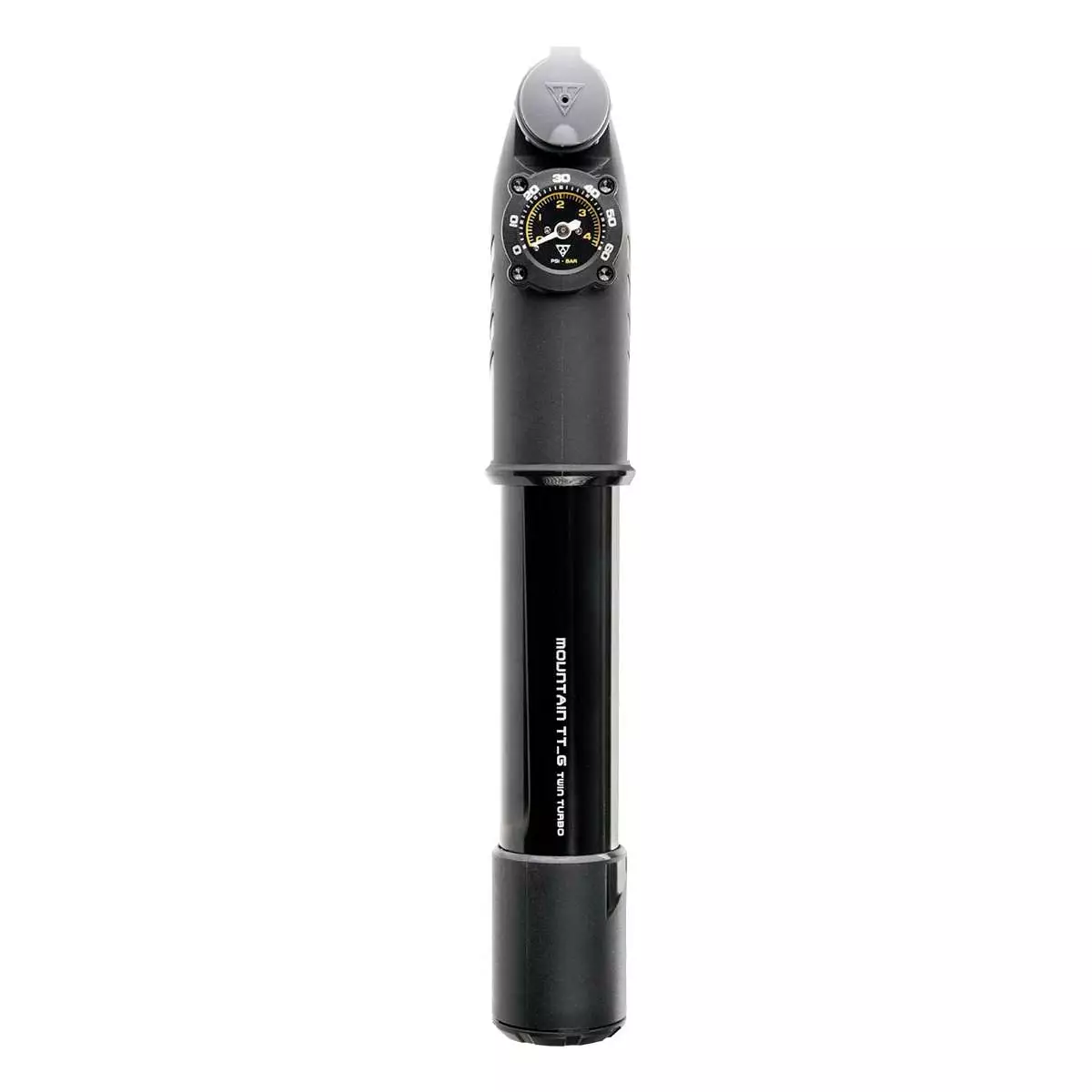 The Topeak Mountain TT_G Mini pump allows for easy trailside inflation of wider MTB tyres, as the TwinTurbo Technology uses both strokes to compress air. Thus, the pump delivers high pressure output which saves time and effort. By pulling the pump piston the larger volume outer barrel compresses huge amounts of air into a smaller diameter inner barrel. This helps you inflate large-volume tyres with ease – whether MTB, MTB Plus or gravel tyres. The easy-to-read gauge reliably shows the pressure needed. A thumb lock lever ensures air-tight seal.