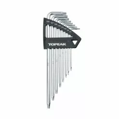 The Topeak star wrench set is a must-have for your tool box. Yet, you can also hang the eight L-shaped star wrenches made of hardened chrome-vanadium steel on the wall for storage using the foldable hanger.