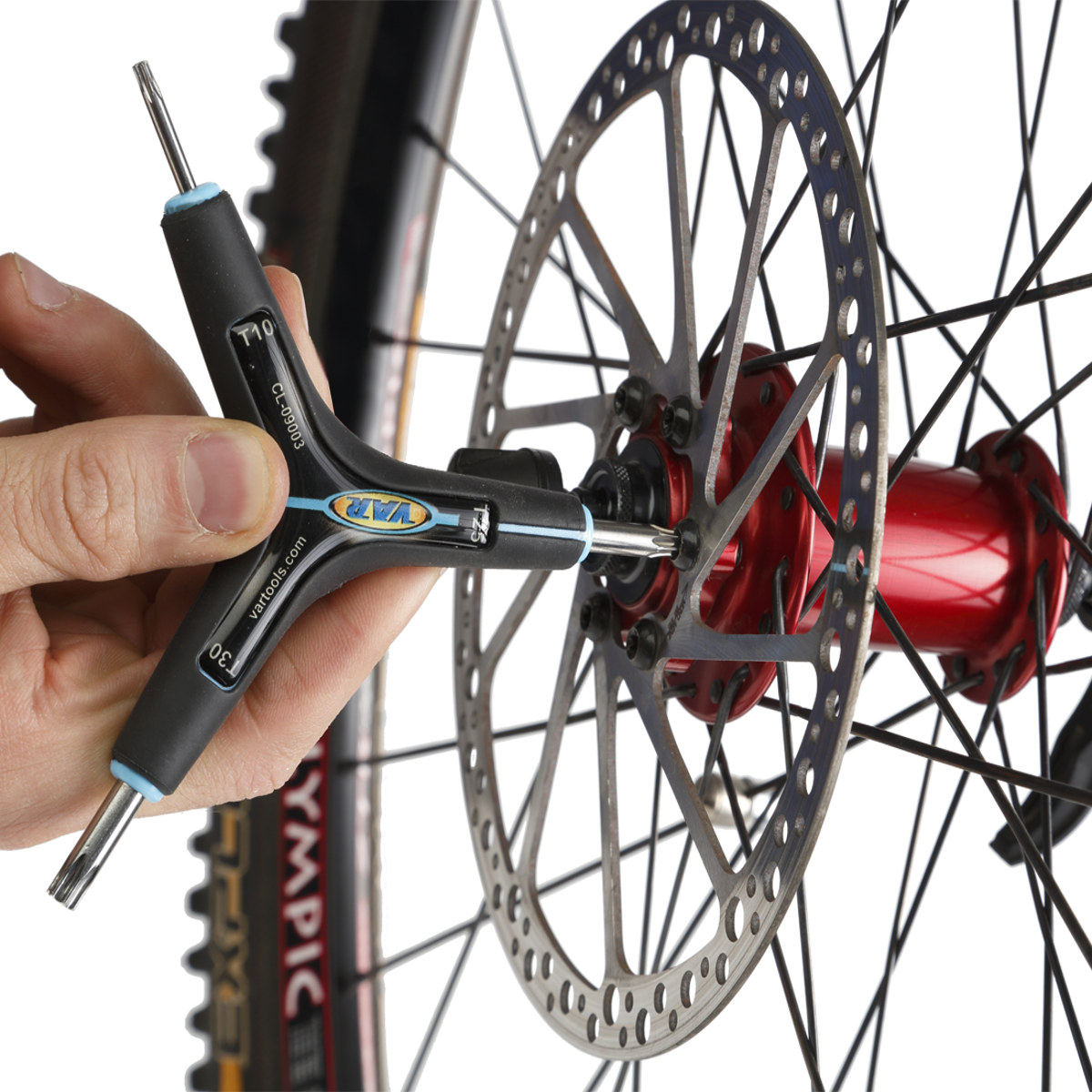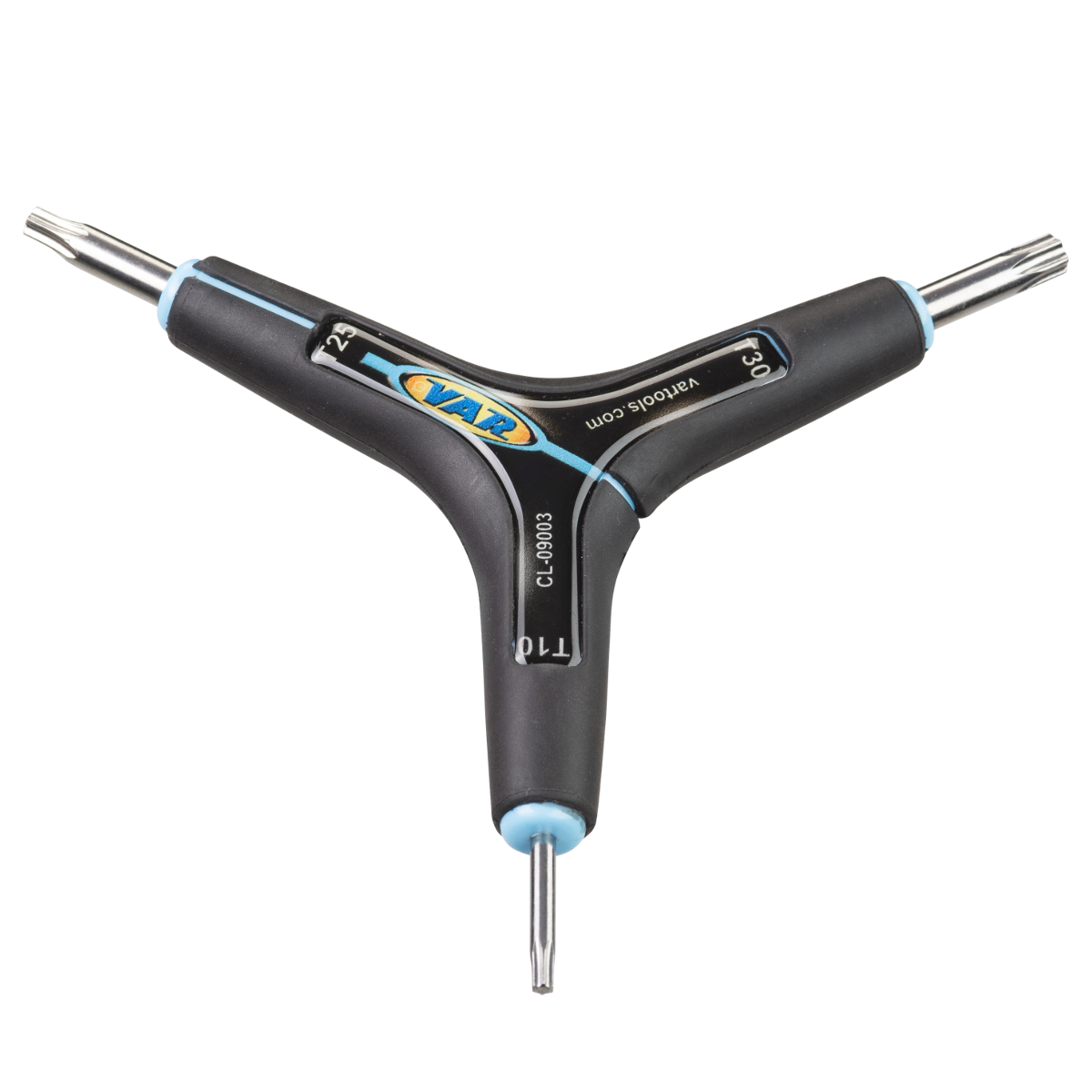 The VAR CL-09003-C features three different star drive wrenches on a single handle. The Y wrench is designed for all common, smaller screw sizes and allows for the installation and adjustment of brakes, lights, mudguard struts etc. The rubber-coated handle of the 3in1 tool