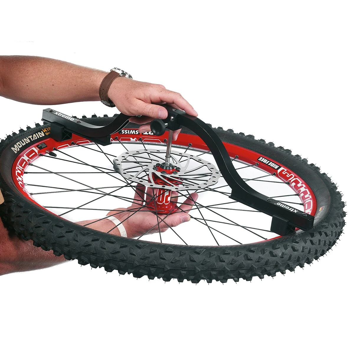 A centering gauge is indispensable for wheel building, but also just for re-centering – especially at the rear wheel, where asymmetric spoke dishes often pull the wheel off centre during centering. With the Xtreme Rundlauf, you can quickly check the concentricity of wheels, even without removing the tyres. This is particularly handy for a quick re-centering. However, it is important however to deflate the tyres.